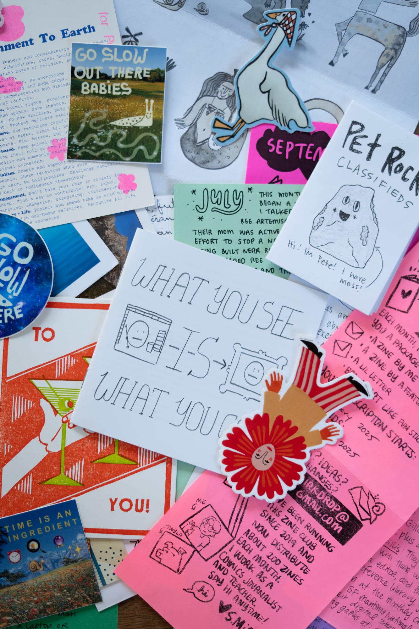 A print by Maren Inga, snail mail and zines from various artists, and a cup by Maren and Laura.